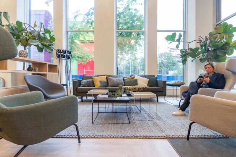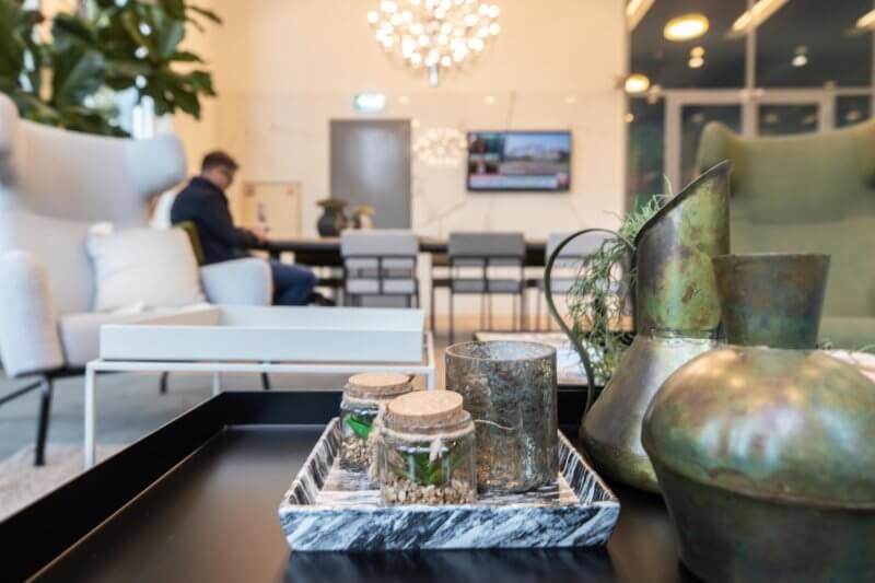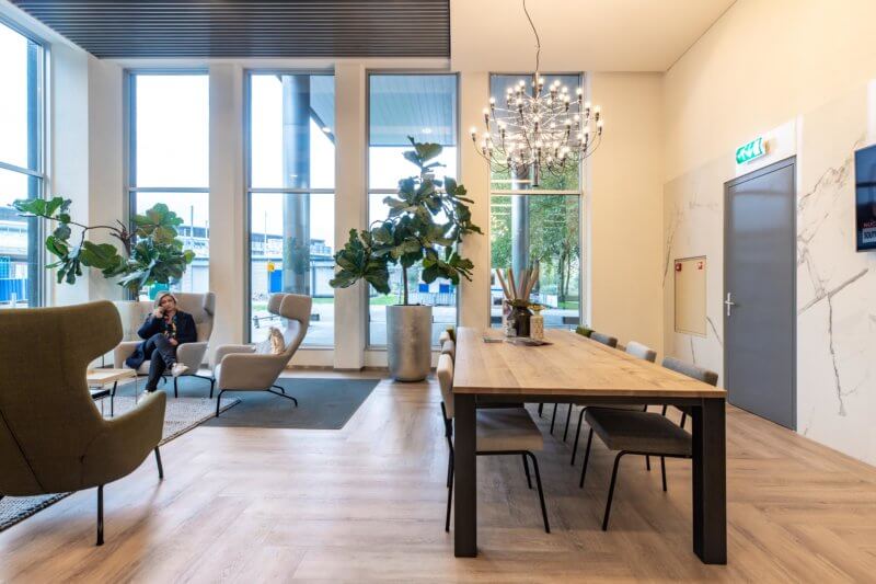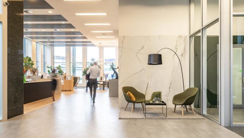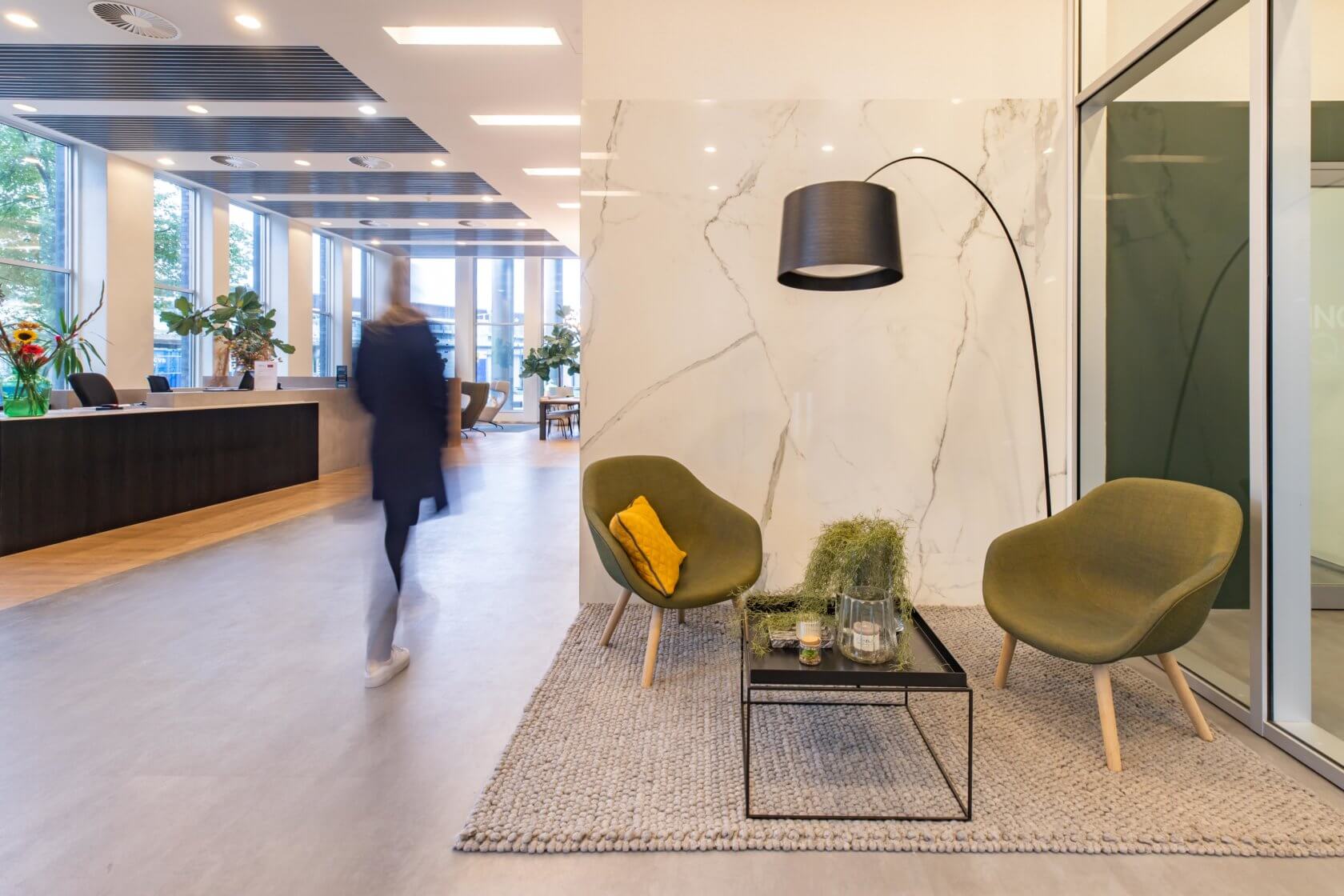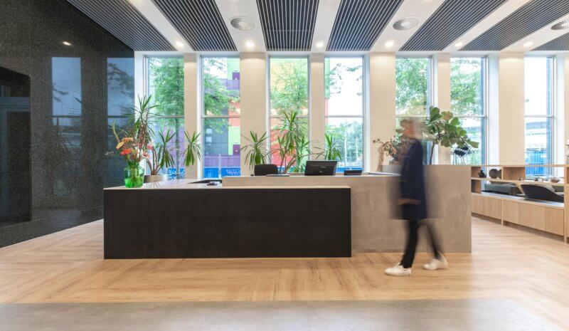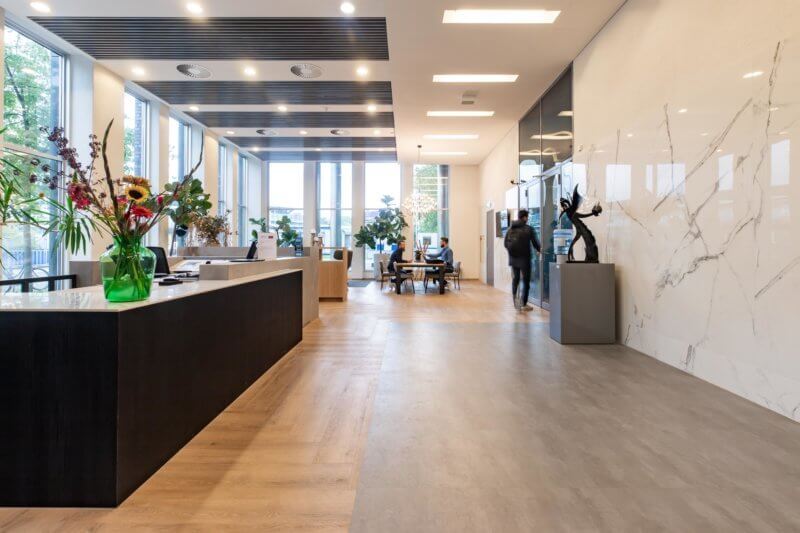 Het Eurocenter Amsterdam is een kantoorpand op de Zuidas. Voor dit kantoorpand hebben wij voor de vloer van de receptie houtlook PVC in lange stroken verzorgd. Aan de wanden in deze ruimte hebben wij de keramische marmerlook XL-slabs geleverd, met de look van calacatta marmer.