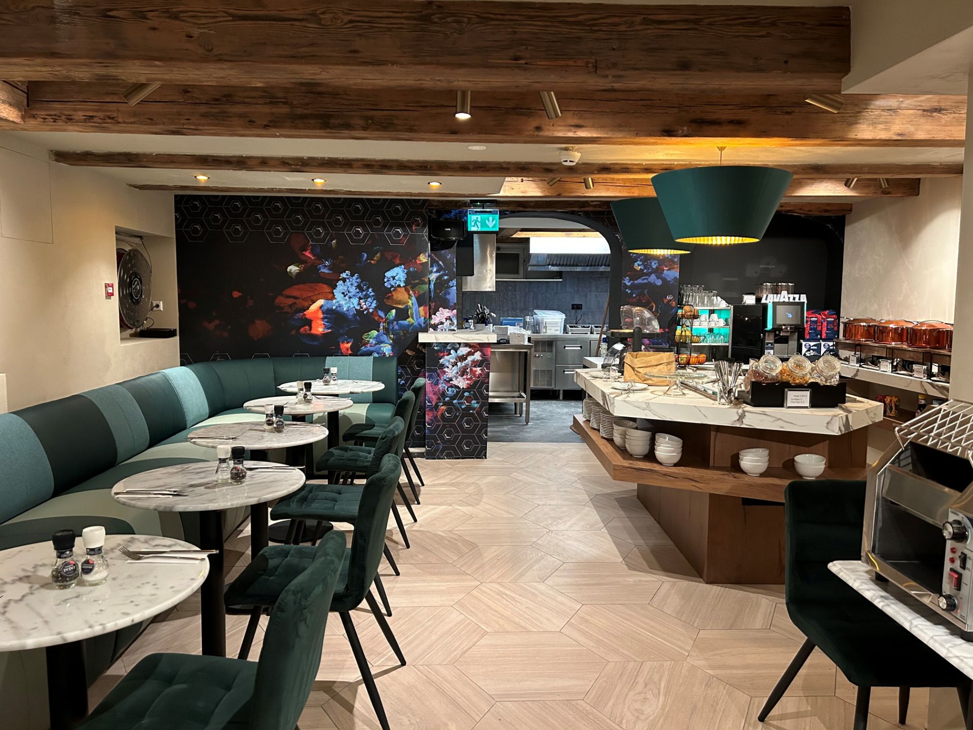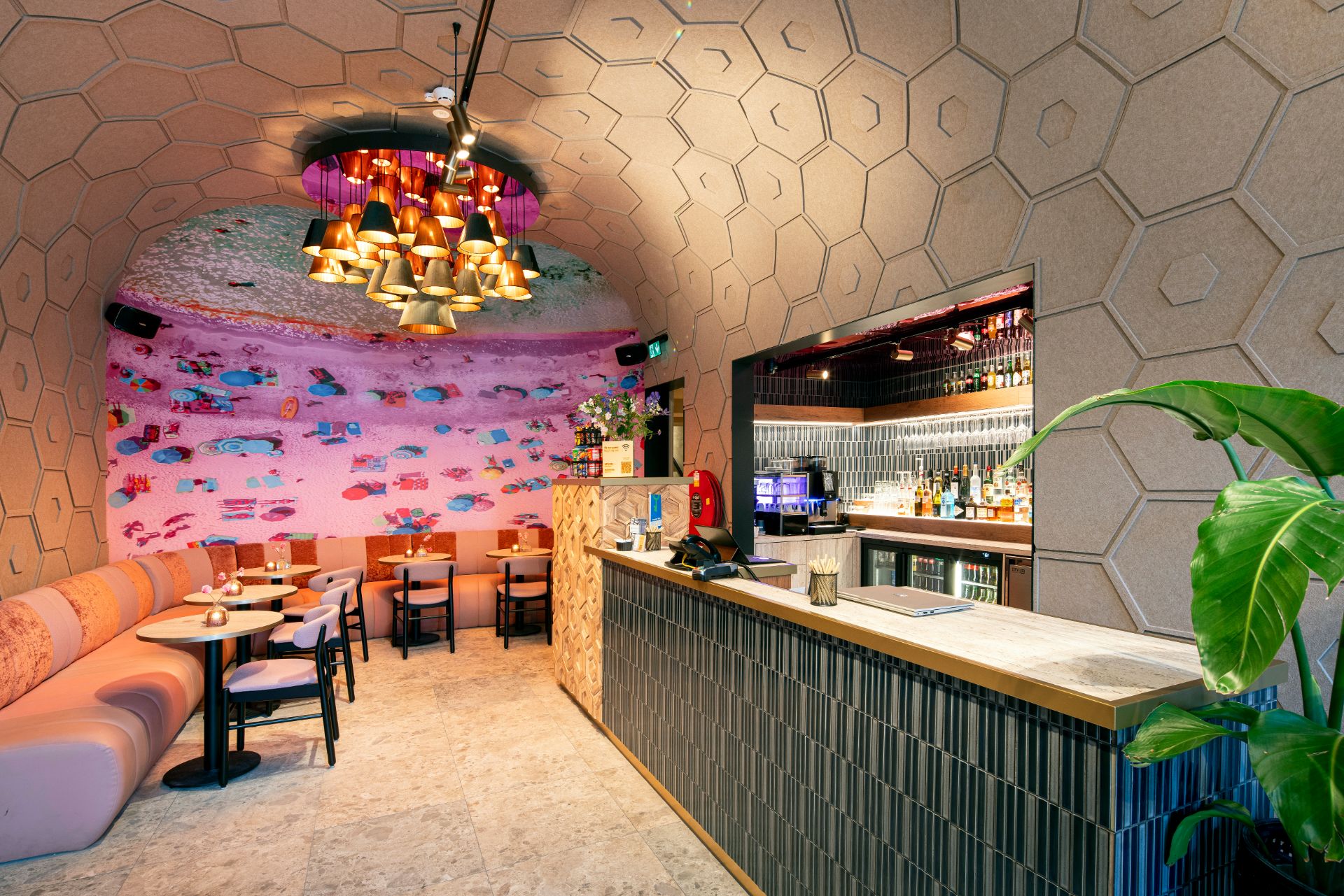 De entree van het hotel is gelegd met een warme Terrazzo look tegel en de bar is bekleed met mozaïek uit de eigen lijn van Osiris Hertman. De ontbijtzaal straalt een bijzondere allure uit met keramisch parket dat is gelegd in een opvallend hexagon patroon. En in de badkamers worden elegantie en pracht gedefinieerd door de travertin wandtegels, met gouden accentwanden die een vleugje luxe toevoegen.