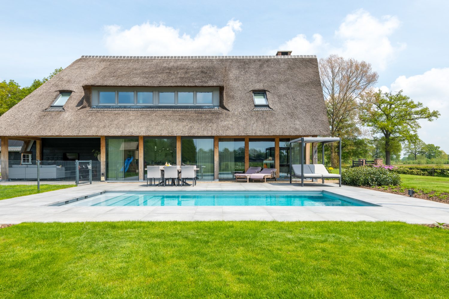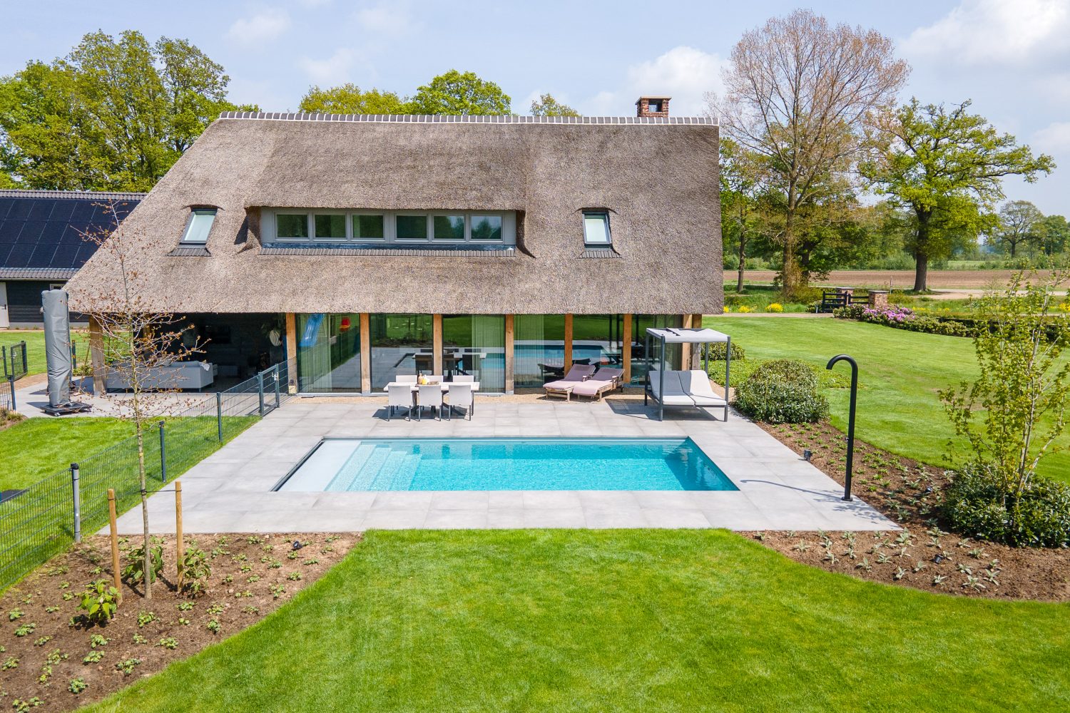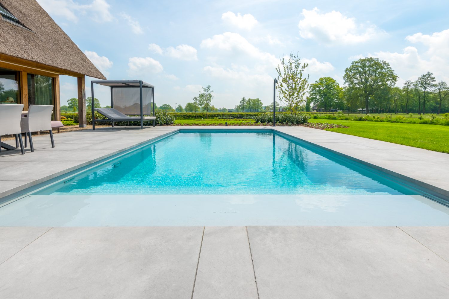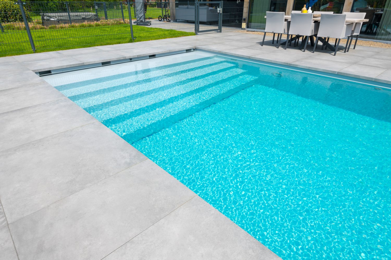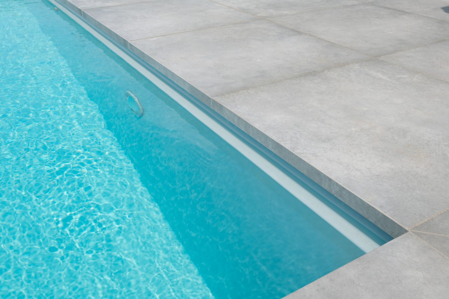 De zwembadtegels en -randen van het project Zwembad Bathmen zijn door ons verzorgd. De betonlook buitentegels bij dit project hebben een formaat van 90x90x2 cm. Van deze tegels hebben wij voor de klant ook de zwembadranden op maat gemaakt, die in hetzelfde formaat als de tegels zijn gebleven waardoor er vrijwel geen verschil tussen randen en tegels te zien is. De keramische betonlook tegels geven een robuuste uitstraling aan dit zwembad.